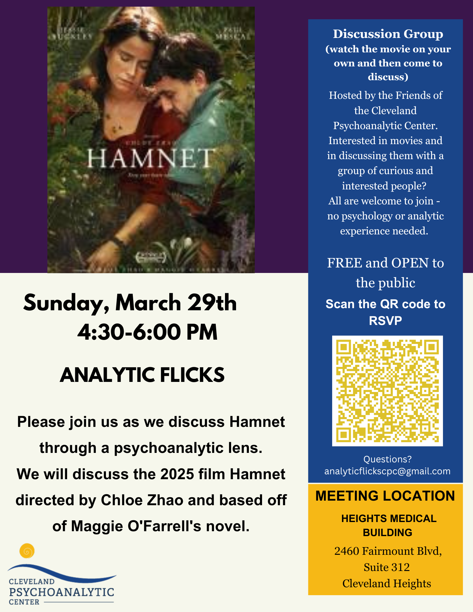 Back to All Events Analytic Flicks: Hamnet Sunday, March 29, 2026 4:30 PM 6:00 PM Cleveland Psychoanalytic Center 2460 Fairmount Boulevard, Suite 312 Cleveland Heights, OH 44106 United States (map) Google Calendar ICS Please join us as we discuss Hamnet through a psychoanalytic lens. We will discuss the 2025 film Hamnet directed by Chloe Zhao and based off of Maggie O'Farrell's novel. Discussion will be lead by Anna Janicki.